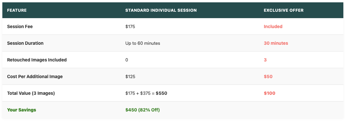 This exclusive offer includes a focused 30-minute session designed for efficiency without compromising quality. You'll receive three professionally retouched images, ready to elevate your team's online presence, pitches, and internal communications. Need more? Additional retouched images are available at just $50 each.